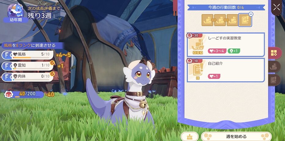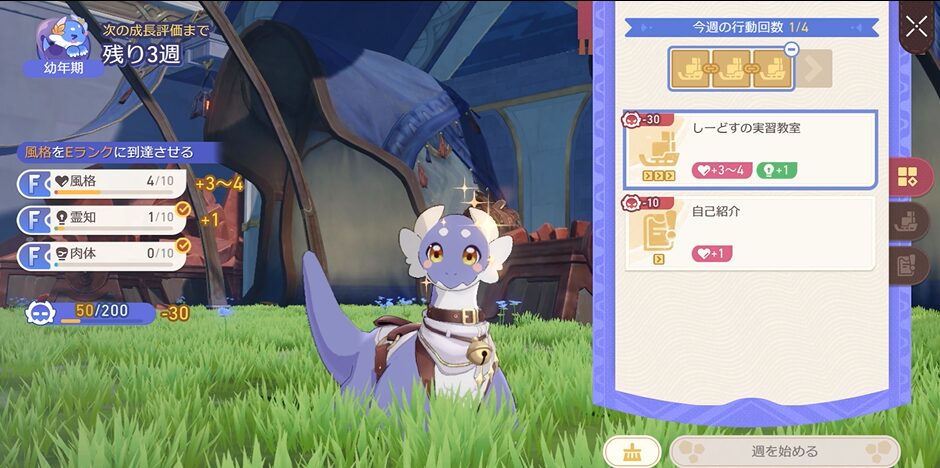 上の画像のように、行動可能な枠が4枠あるにも関わらず3枠だけで育成を開始することはできませんので、以下画像のように行動可能枠を埋めてから育成を開始しましょう!