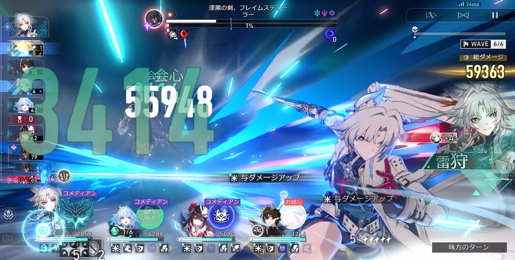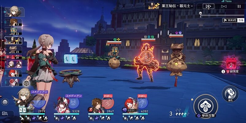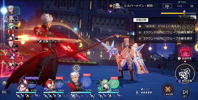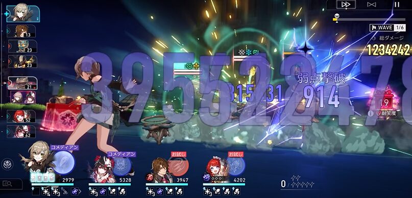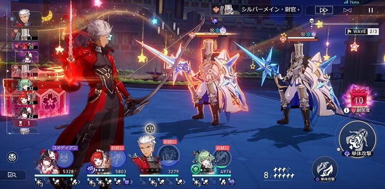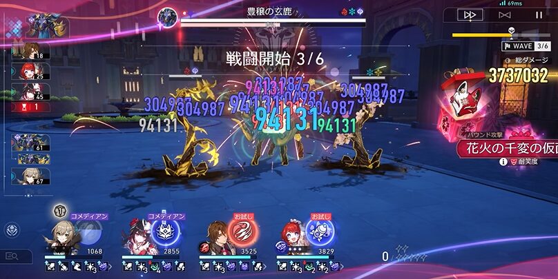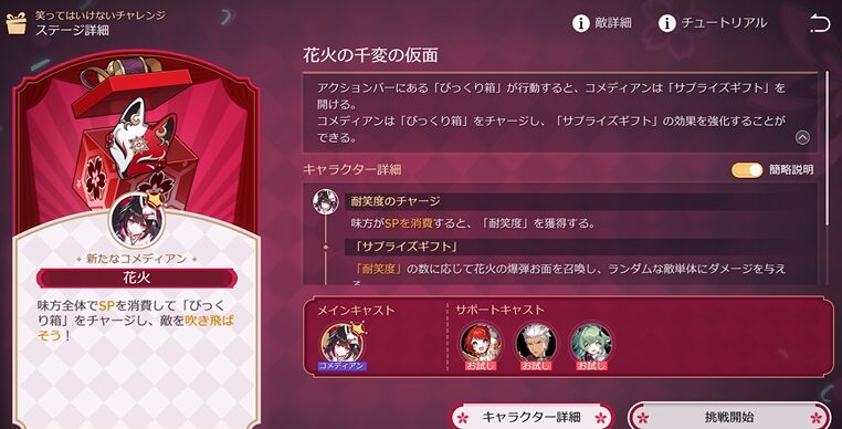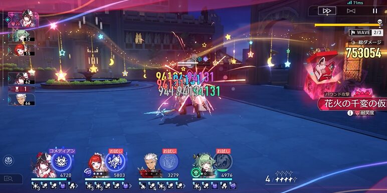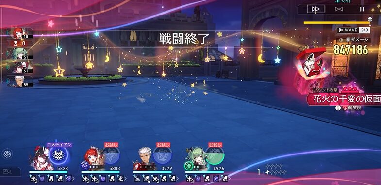 まずは最初のステージです!編成はお試しキャラを使用していますが、皆さんが所持しているキャラクターに変更すると花火の速度などが異なり以下の攻略と多少の誤差が生まれる可能性がありますので、その点ご留意ください。