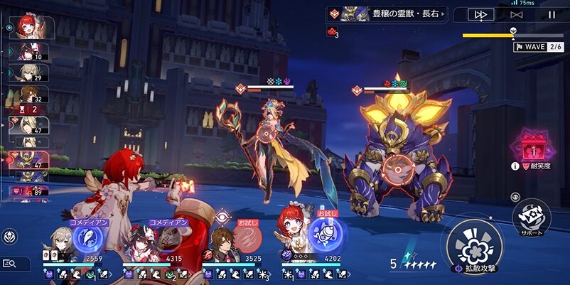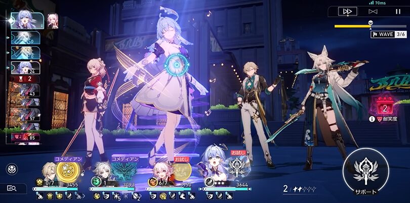 先ほどの飛霄のように、チーム全体でサンポをサポートしていきます。サンポの必殺技発動がメインですので、EPを回復するフォフォの必殺技もうまく使用してステージを進めていきましょう!