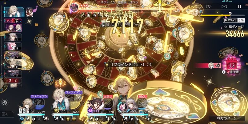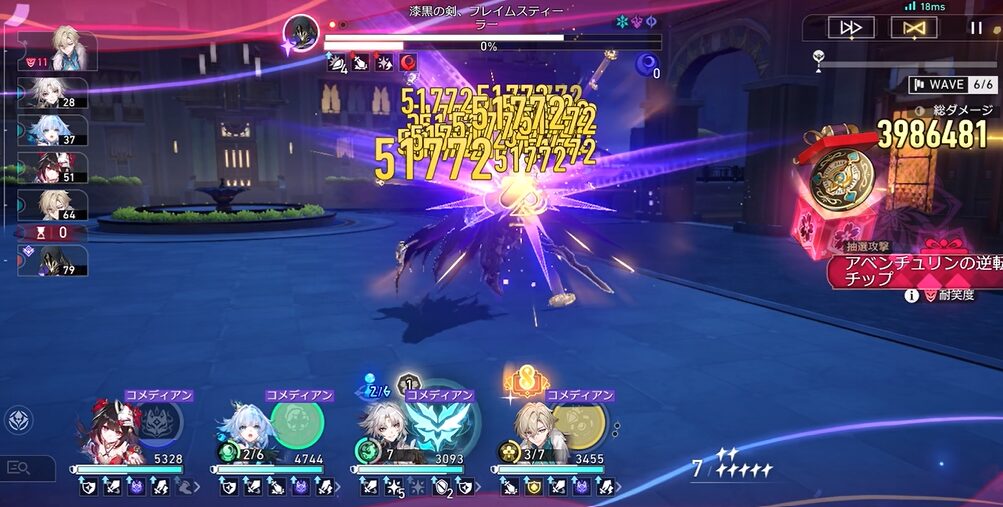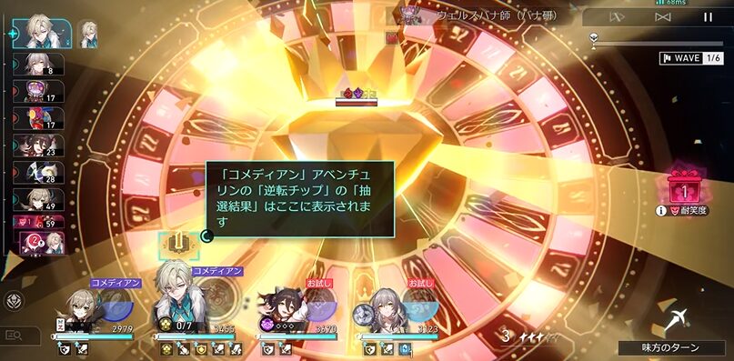 アベンチュリンは必殺技を発動すると逆転チップを振り、「8」が出ればサプライズギフトの行動を早め敵に大ダメージを与えます。