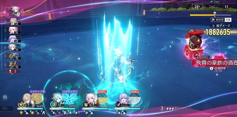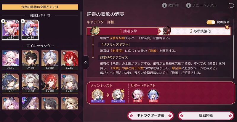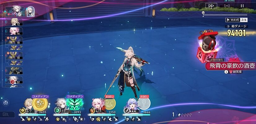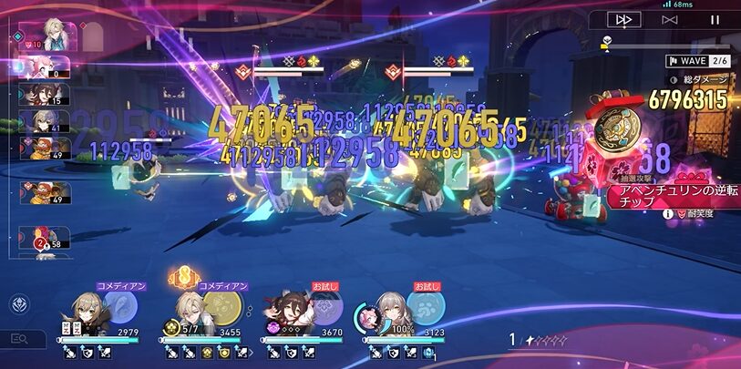 皆さんも自分の好きな編成で挑戦してみて下さい!ただ何戦かして耐久キャラがいた方がよいと感じましたので、アベンチュリンは入れておくといいと思います!