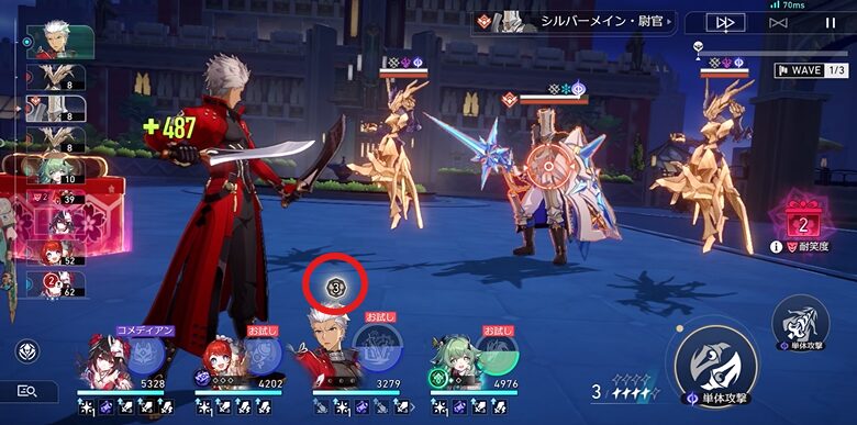 本ステージでは、花火が戦闘スキルを発動するとその対象の味方が指定回数分SPを消費せずに戦闘スキルを使用できます!以下画像のように戦闘スキルを発動した味方キャラクターのアイコン上に数字が出現します。
