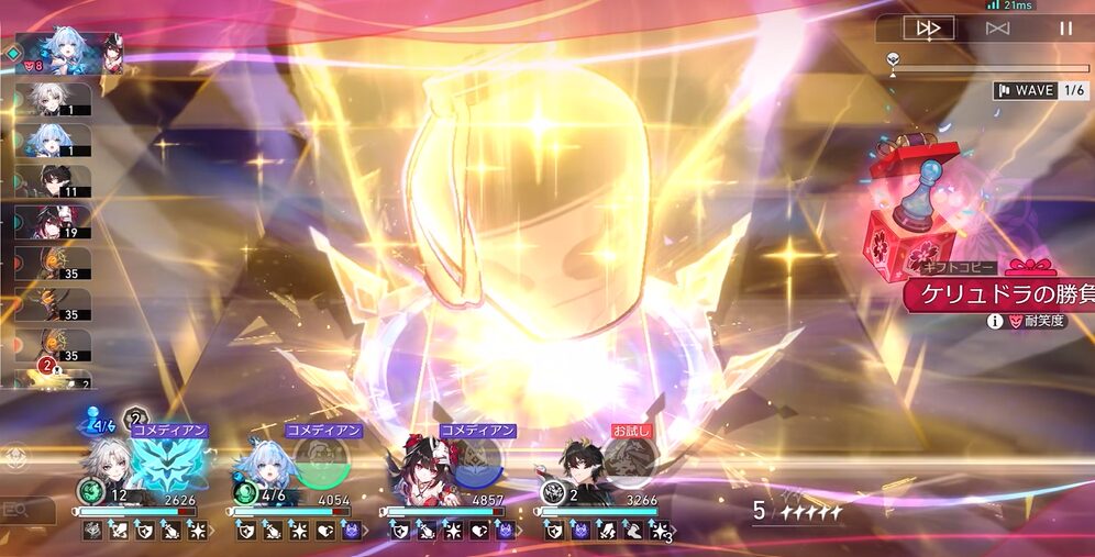 ケリュドラは直前で発動した「サプライズギフト」を再度発動します。この編成の並びですと飛霄の「サプライズギフト」が二回発動します。