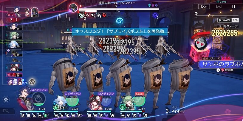サンポが必殺技を発動すると、サプライズギフトが発動しゴミ箱達が追加で攻撃してくれます。