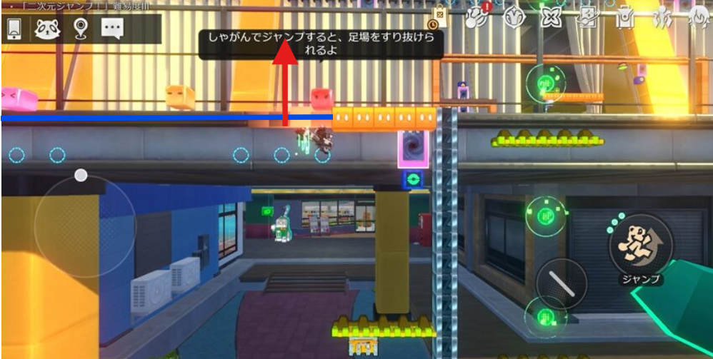 ただ、近くの赤い初が喋っているように、以下画面の青い線が引かれた場所で、「操作キーを上に下状態でジャンプ」を押すとすり抜けることが出来ます。以下画面、赤矢印付近でこの操作を行ってみて下さい。
