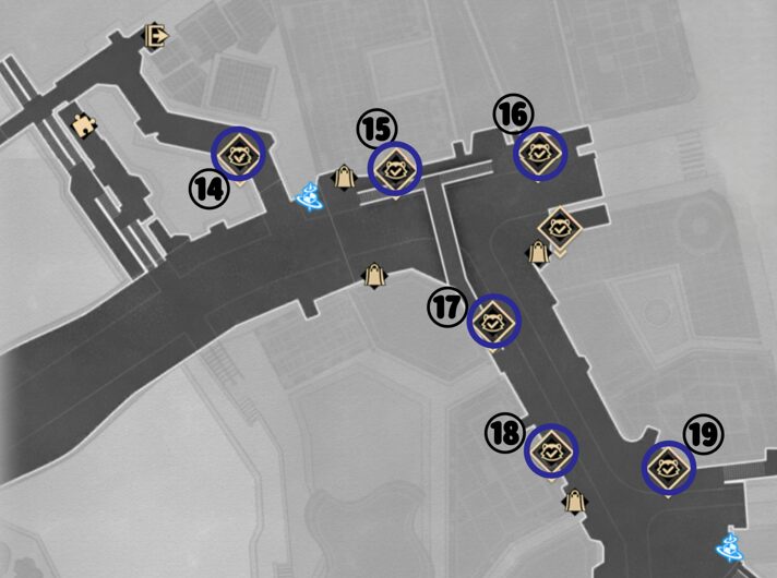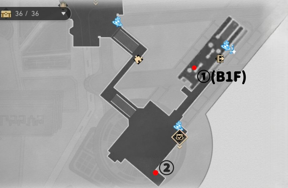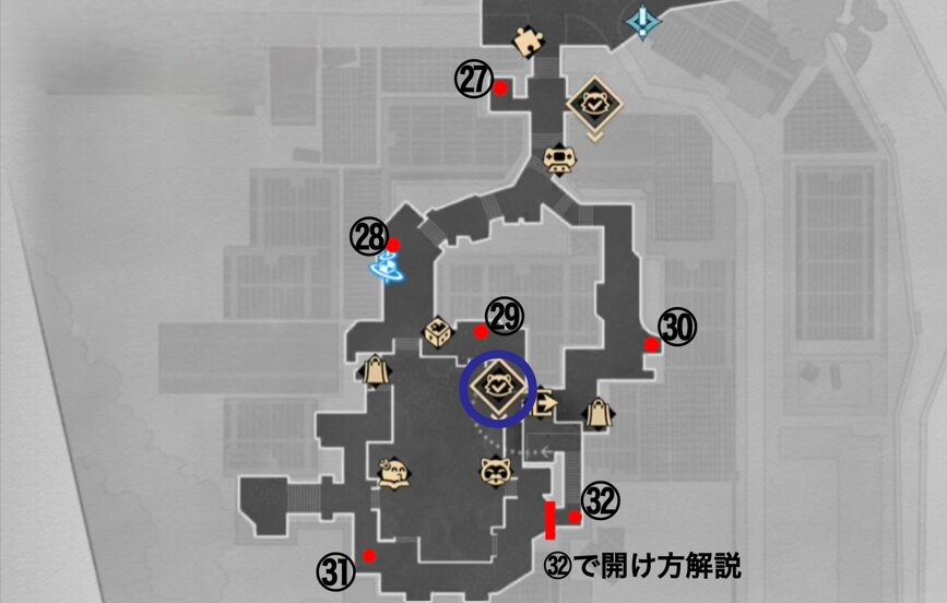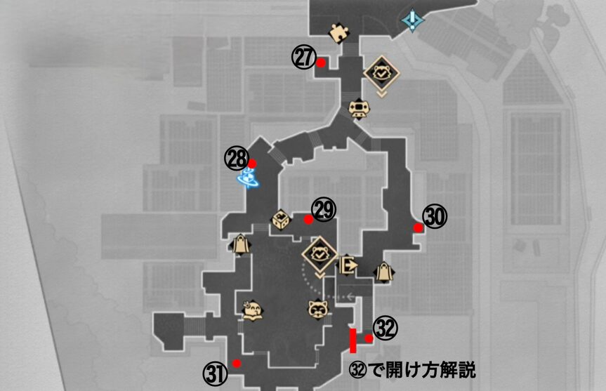 ㉜の宝箱に向かう扉は閉ざされていますので、この扉の向こうに行く方法を解説します。以下マップ中央の青い丸で囲まれた「二次元ジャンプ!」に入ってください。