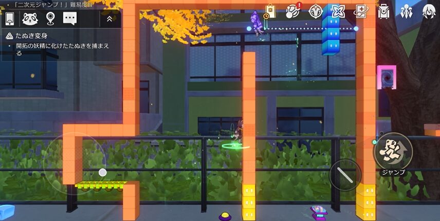 戦狸品は宝箱㉕の「二次元ジャンプ!」内に潜んでいます。このギミック内に入ると、鏡写しのタヌキを捕まえなければなりません。まずは鏡側のタヌキを、トランポリンの右に移動させます。