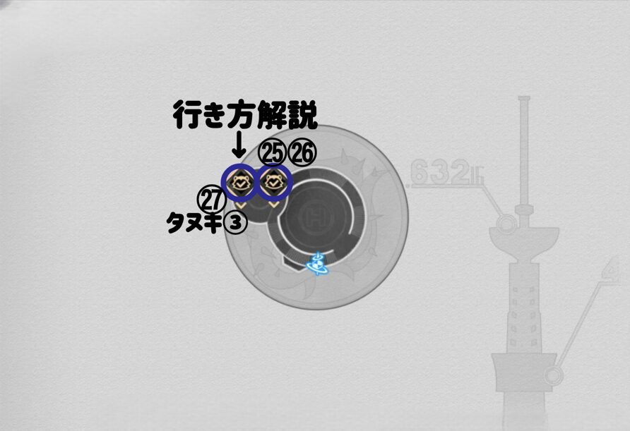 宝箱㉗がある二次元ジャンプは、地上からは向かうことが出来ません。ひとつ前の宝箱㉖を獲得した場所のすぐ近くにある出口から出ましょう。