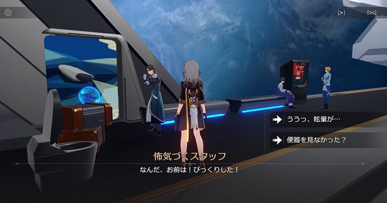 調べると「ホーム」に強制テレポートし、「怖気づくスタッフ」との会話が始まります。