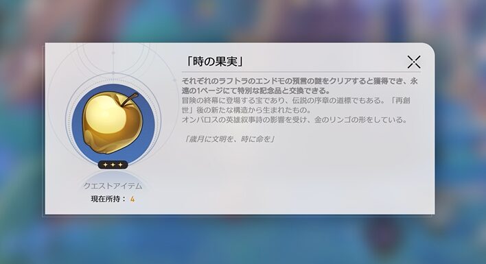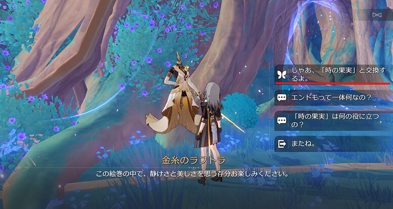 これはこれまでのエンドモ探索で既に数個獲得している人もいると思います。所持していない方はラフトラに話しかけて「時の果実」と交換できます。