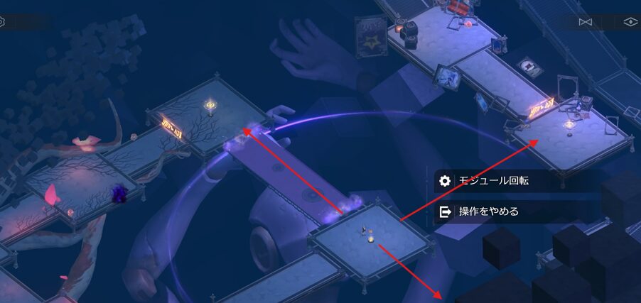 左上、右上は道が見えており進みやすいと思いますので、その先にある宝箱⑪、宝箱⑫は獲得できると思います。宝箱⑩を獲得するには「モジュール回転」で動く橋を右下に移動させます。そのまま進むと上から道は見えませんが、黒いブロックの下にも道があり、その先に進むことができます。「ドリームレンズ」を回収するで元の視点に戻りましょう。