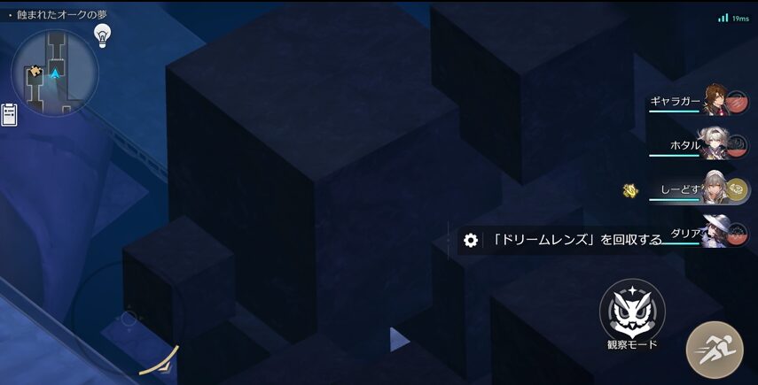 黄色★の「ドリームワープ」を起動したら道なりに進みます。全体マップの水色の★まで進むと以下画像のような「モジュール回転」が可能な「ドリームレンズ」を操作することができると思います。この「モジュール回転」により3方向に進むことができます。