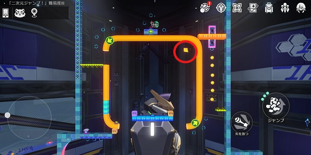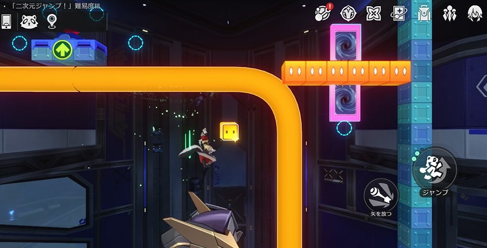 二次元ジャンプ入り口から右上方向に進み、左上に見える扉で閉ざされたワープ扉を目指します。